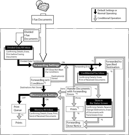 [Store/Print]: Files with forwarding errors are stored in the Memory RX Inbox if <Use I-Fax Memory Lock> is set to 'On'. If these settings are set to 'Off', the files are printed.