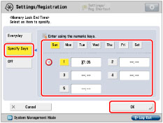 If you select [Specify Days], select a day of the week ([Sun] to [Sat]) → select a number ([1] to [5]).