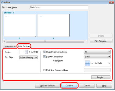 If you want to edit the print settings of the combined file, click [Print Settings] → specify the desired settings → click [Combine].