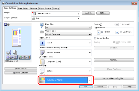 [Auto [Color/B&W]] switches automatically between color printing and black-and-white printing according to the type of data.
