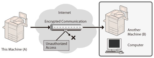 You can perform safe encrypted communication when the user is accessing the machine via a Web browser by installing a server certificate to the machine. With SSL communication, a common key that can only be used by the user and the machine is generated using the server certificate and public key. Doing so will help prevent data interception and theft. See