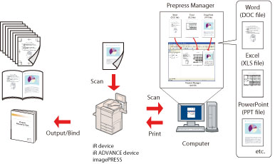 Prepress Manager is a printing application. Wide range of imposition modes enable you to create, edit, and print various documents. You can use the export mode to convert the scanned data into PDF, JPEG, TIFF, or BMP files. You can also edit and correct scanned image using the standard-equipped Image Editor.