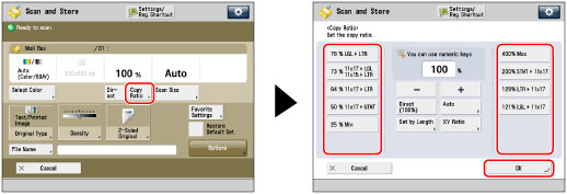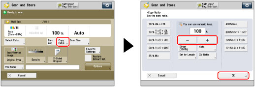Press [Copy Ratio] → adjust the zoom ratio using [-] and [+] → press [OK].