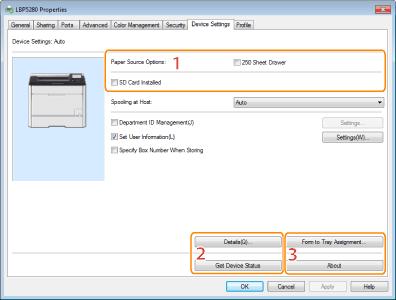 You can obtain device information and update the settings displayed in the sheet (see "Setting the Printer Options").