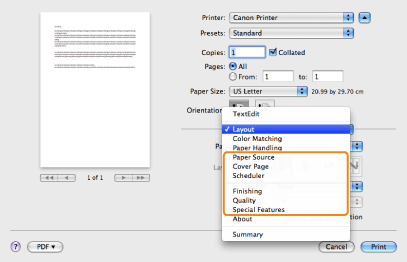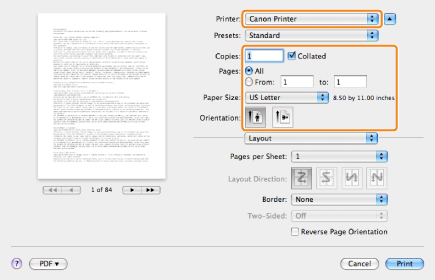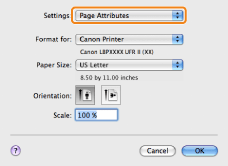 In Mac OS X 10.5.x, the [Page Setup] dialog box may not be displayed, depending on the application you are using. If this is the case, you can specify the page size, page orientation, and scaling in the [Print] dialog box.