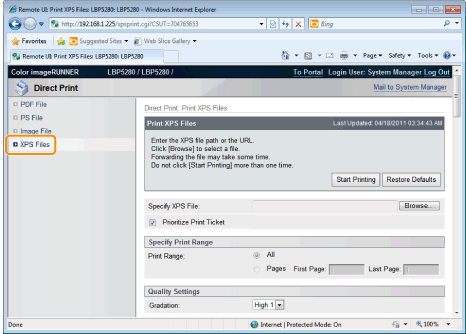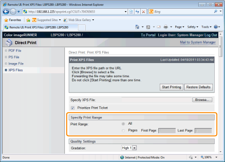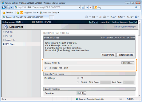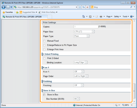 If the [Prioritize Print Ticket] check box is selected, some items cannot be set via the Remote UI. To use all the print settings made via the Remote UI, clear the [Prioritize Print Ticket] check box.