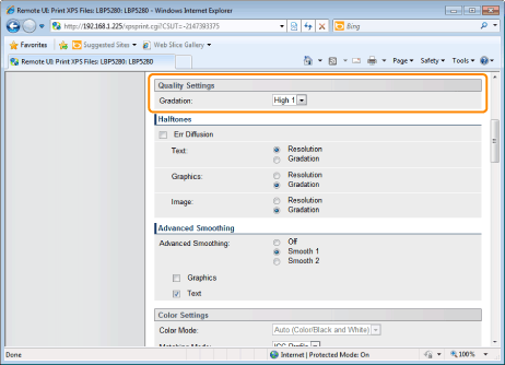 Specify the gradation process for printing the data. It is effective to set [High 1] when printing photographs at standard quality, and to set [High 2] when printing at a higher quality.