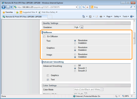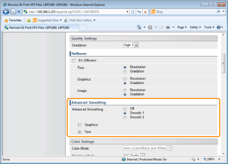 [Graphics] and [Text] settings on the printer console are suitable only when [Advanced Smoothing] on the printer driver is set to [Printer Default].