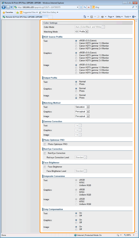 It sets which color matching method to apply for each piece of text, diagram or image that make up a print job, or for every color space such as RGB or CMYK. You can select whether to use methods such as ICC profile and gamma for processing. The items that can be set depend on the PDL type.