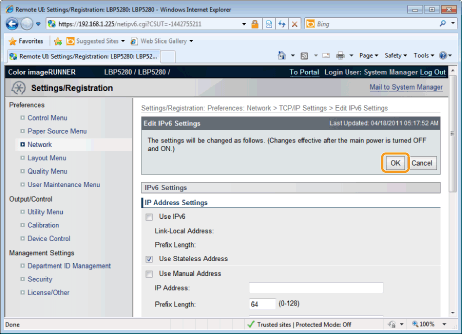 After the [Use Stateless Address] check box is selected and the printer is restarted, the stateless address is displayed automatically. This stateless address is discarded when the printer is turned OFF.