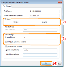Enter an arbitrary print queue name in [remote queue name] and the IP address or name of the printer in [Hostname of Remote Server].