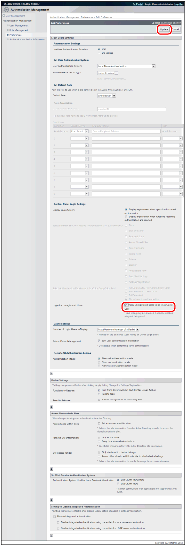 The [Login for Unregistered Users] setting is enabled after the device is restarted. For information on restarting the device, see the instruction manuals included with the device.