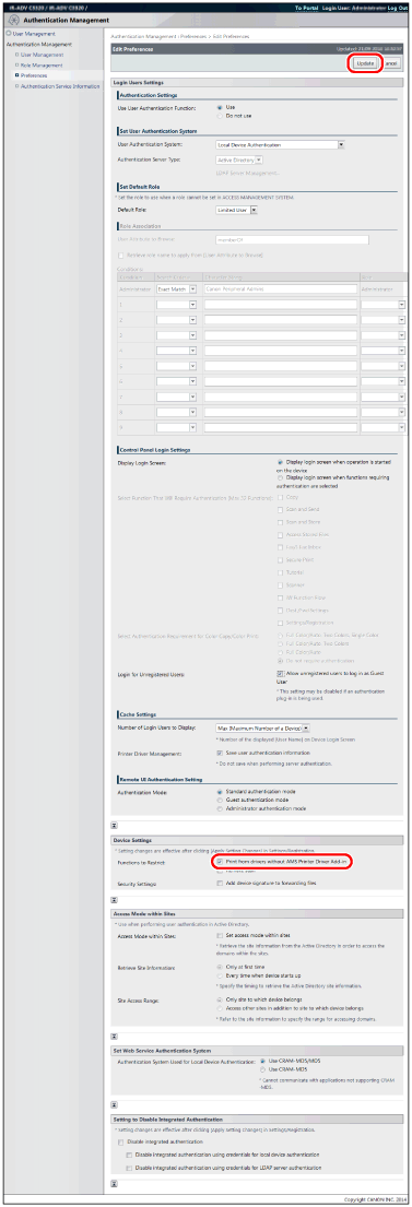 Direct Printing from the Remote UI is also included in the jobs restricted by the settings in this item. If [Print from drivers without AMS Printer Driver Add-in] in [Functions to Restrict] is selected, you cannot use the Direct Printing from the Remote UI.