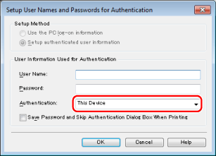If you select [Save password and skip authentication dialog box when printing], you can print without entering passwords. However, it is recommended you set to enter a password each time printing is performed, for increased security. [Save password and skip authentication dialog box when printing] is enabled if you select [Save user authentication information] in [Printer Driver Management] when specifying the preferences of the devices. For more information, "Specifying the Preferences of the Devices."