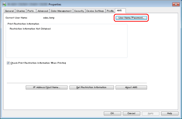If the print restriction information registered in the device is changed, click [Get Restriction Information] on the [AMS] page to retrieve the latest print restriction information. If the print restriction information registered in the device and the print restriction information in the AMS Printer Driver Add-in differ, an error will occur. Take care, as documents for which printing is only allowed once will become unable to be printed.