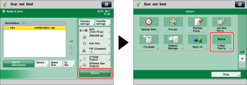 Specify the destination → press [Options] → [E-Mail Priority].