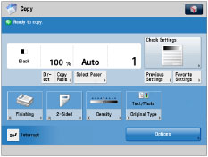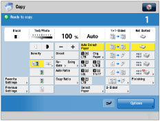 Press to select a [Options] mode. [Finishing], [2-Sided], [Density], and [Original Type] are set as default. |