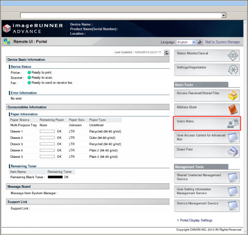 To use the Remote UI, set [Remote UI] in [Management Settings] (Settings/Registration) to 'On'. (See "Remote UI.")