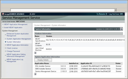 You can confirm version data relating to platforms (such as Java Virtual Machine), and version data, date of installation, current status, etc. of system applications.