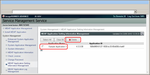 Select the MEAP applications that you want to delete → click [Delete].