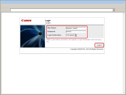 Enter the user name and password of a user registered as a user for the Local Device Authentication System of SSO-H → select [This device] as the login destination → click [Log In].