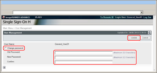 Select [Change Password] → enter the appropriate passwords → click [Update].