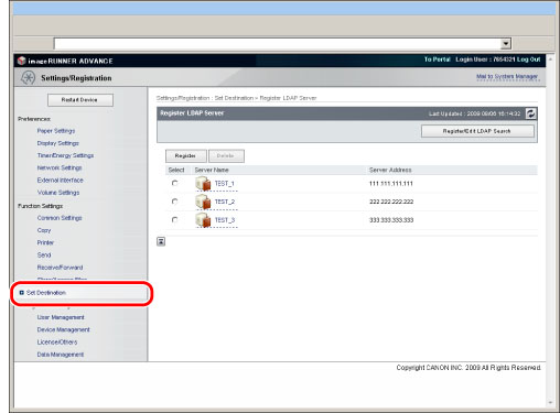 (Settings/Registration) → [Set Destination] → [Register LDAP Server]. For instructions on using the control panel to specify LDAP settings, see "LDAP Server Settings."To specify LDAP server settings, it is necessary to log in as an administrator.