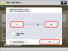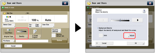 If you adjust the background density by pressing [Adjust] for <Background Density>, the [Auto] setting is canceled. Similarly, if you press [Auto] while making manual adjustments in [Adjust], your adjustments are canceled. The machine automatically adjusts the density to match the background.