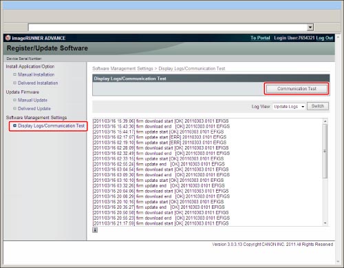 Press [Software Management Settings] → [Test Communication].