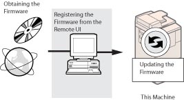 You can update the firmware of the machine to the most recent version using the "Register/Update Software" function from the Remote UI.