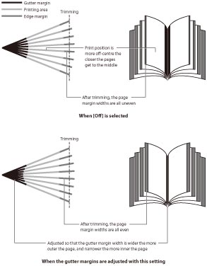 printing may also be cut off (depending on the number of pages and paper thickness when the edges are trimmed to make them even). Using creep correction to adjust the margin of the gutter can correct such uneven printing (creep).