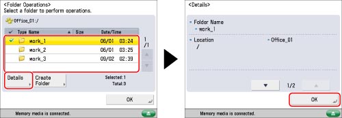 Select the desired storage location → select the desired folder level → press [Folder Operations].