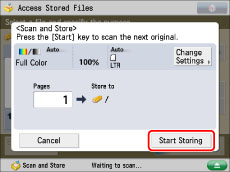 If the following screen is displayed, after the last batch of originals is scanned, press [Start Storing].
