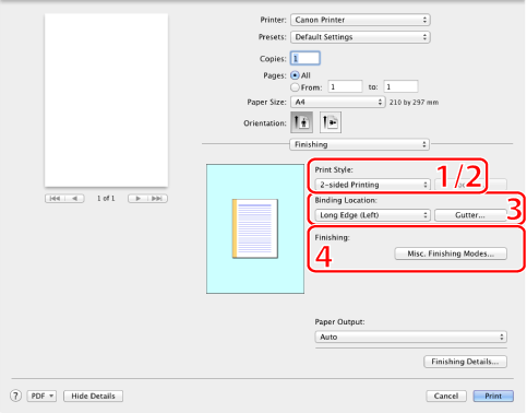 Prints on one or both sides of the paper. The default setting for [Print Style] is [2-sided printing] (see "1-sided and 2-sided Printing").