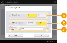 The exclusive community is a community (group) prepared for managers using Canon software such as imageWARE Enterprise Management Console. To use the exclusive community, press <Set Dedicated Community>. To specify a general community, press <Set Community Name 1> or <Set Community Name 2>.