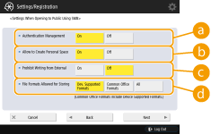 To create an exclusive folder for personal use in the Advanced Box, press <On>. If <Authentication Management> is not set to <On>, setting is not possible.