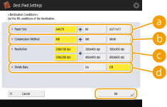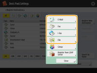 Select the functions to use for the destination, from <Fax>, <E-Mail>, <I-Fax>, or <File>.