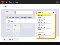 <Address List 1> to <Address List 10> can be regarded as 10 separate address books. Classifying an address list by department or by business partners makes them easier to find when specifying a destination. It is also easier to manage an address list if you change their names to department name or business partner name (<Set Destination>  <Rename Address List>).