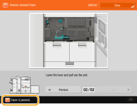 If you press <Close> on the touch panel display indicating a paper jam, operation and setting may continue without immediate correction of the paper jam.