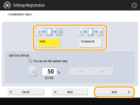 To superimpose the form image without adjusting the density, press <Solid>. To superimpose the form image with the density decreased, press <Transparent> and adjust the density.