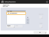 To change the name of a form image already registered, select the form image from the list in step 5 and press <Details>  <Rename Form>. To delete a form image, select the form image from the list and press <Delete>.