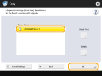 If you want to print a form image by itself to check the output, select the form image from the list and press <Check Print>. If you want to confirm the size of the form image and the overlap setting, press <Details>.