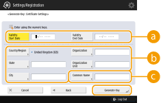The machine can generate the key and certificate (server certificate) used for TLS encrypted communication. If you want to start using TLS encrypted communication immediately, it is convenient to use the key and certificate that are preinstalled in the machine. If necessary, have an administrator generate a key and certificate. Note, however, that TLS encrypted communication is not enabled simply by generating a key and certificate. Configuring the Key and Certificate for TLS