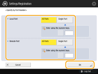 Press <Specify by Port Number> to use port numbers when specifying the ports that IPSec applies to. Select <All Ports> to apply IPSec to all port numbers. To apply IPSec to a specific port number, press <Single Port> and enter the port number. After specifying the ports, press <OK>. Specify the port of this machine in <Local Port>, and specify the port of the communication peer in <Remote Port>.