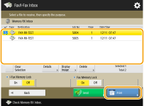 To use this function, you need to activate the memory reception function first (<Set Fax/I-Fax Inbox>  <Use Fax Memory Lock> and <Use I-Fax Memory Lock>), and then follow the procedure below to specify the settings so that incoming documents can be received in memory.