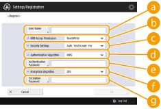 <Security Settings>Set a combination of authentication and encoding. Select <Auth. Yes/Encrypt. Yes>, <Auth. Yes/Encrypt. No>, or <Auth. No/Encrypt. No>.