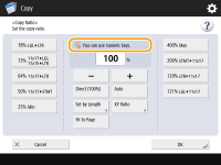 You can use numeric keys.> is displayed, you can enter numerical values using the numeric keys on the control panel.Example: <Copy Ratio> setting screen ![]() When <