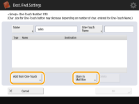 If you want to select a destination from a one-touch button, press <Add from One-Touch>  select the destination  press <OK>. If you want to select a Mail Box (machine's temporary storage space), press <Store in Mail Box> select the Mail Box  press <OK>.