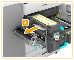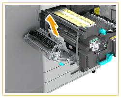 Gently pull out the paper on the left side of the fixing unit, and remove the jammed paper.