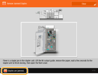 If a staple jam occurs in the saddle stitcher unit or the stapler unit of the finisher, the location of the staple jam and the solution are displayed on the touch panel display. Follow the on-screen instructions to solve the problem. For details on how to clear the staple jams, see the following sections.